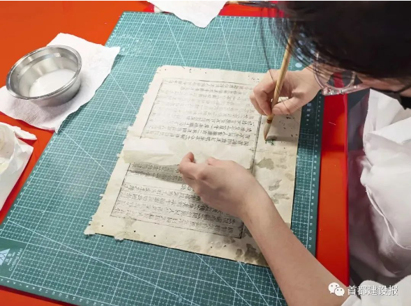 走進東城區(qū)炮局胡同1號漢龍文獻保護中心,修復(fù)師們正在全神貫注做著單頁紙托背修復(fù),他們用筆在蟲洞破損處涂上漿糊,補上紙,再用鑷子撕去補紙多余部分,最大程度地將古籍修復(fù)成原狀。